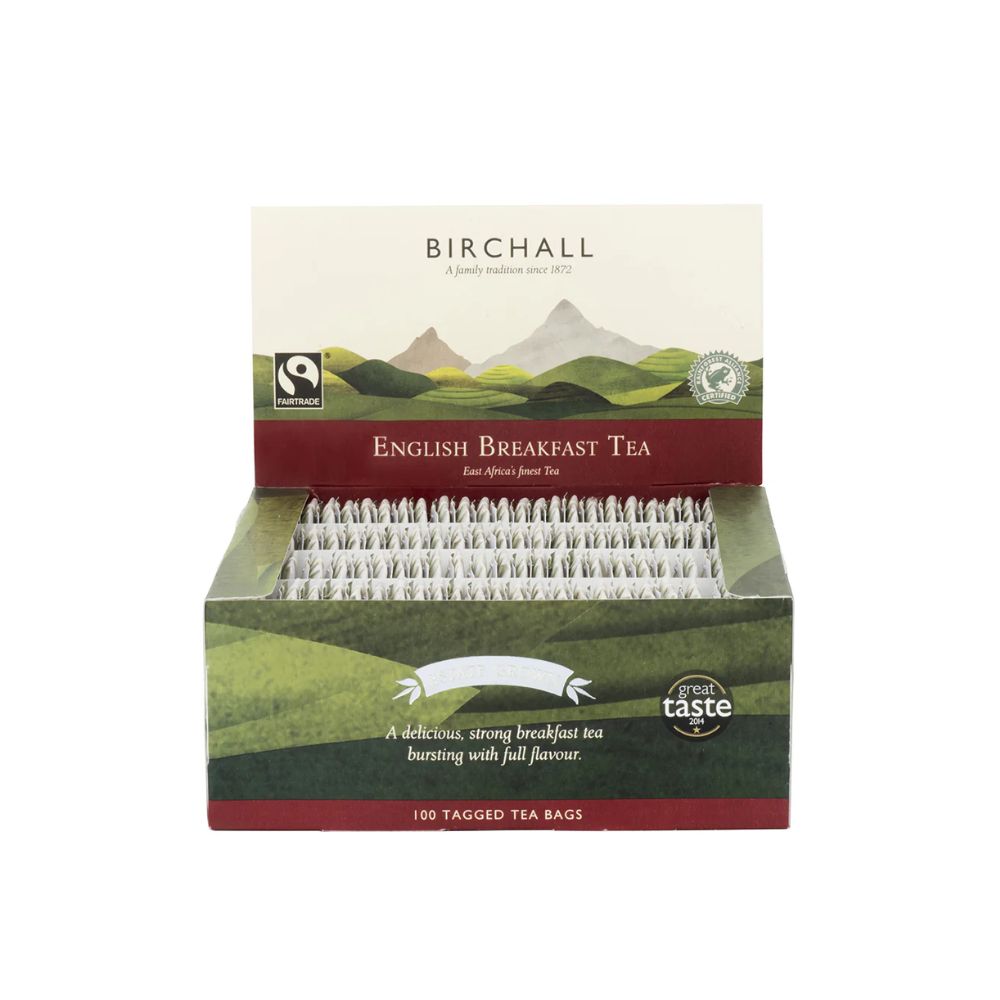 100 tagged Birchall English Breakfast teabags per case